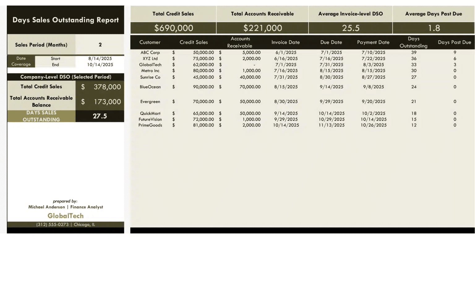 The template eliminates manual DSO calculations while providing both company-wide and customer-level insights. Whether you’re a CFO monitoring working capital or an AR manager prioritizing collection calls, automated DSO analysis delivers the visibility you need.