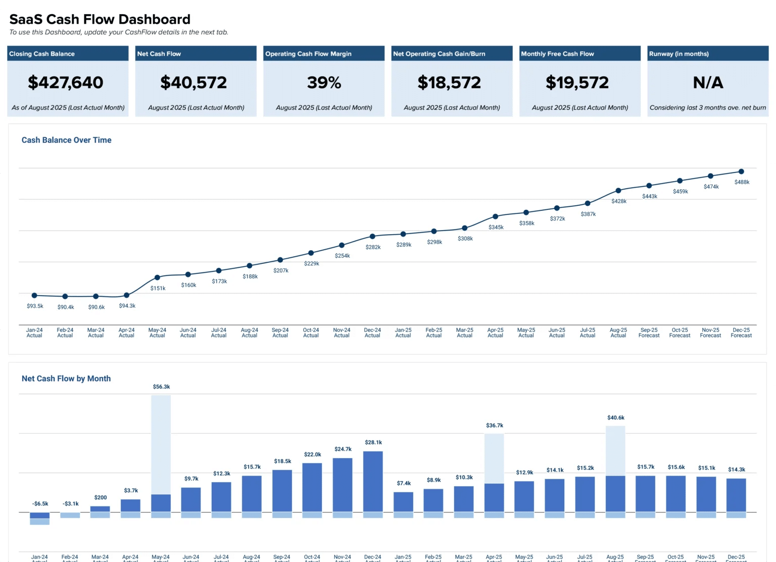 Track the metrics that matter—MRR, ARR, burn rate, runway, and custom KPIs—in one view. Live data connections mean your dashboard reflects reality, not last month’s numbers.
