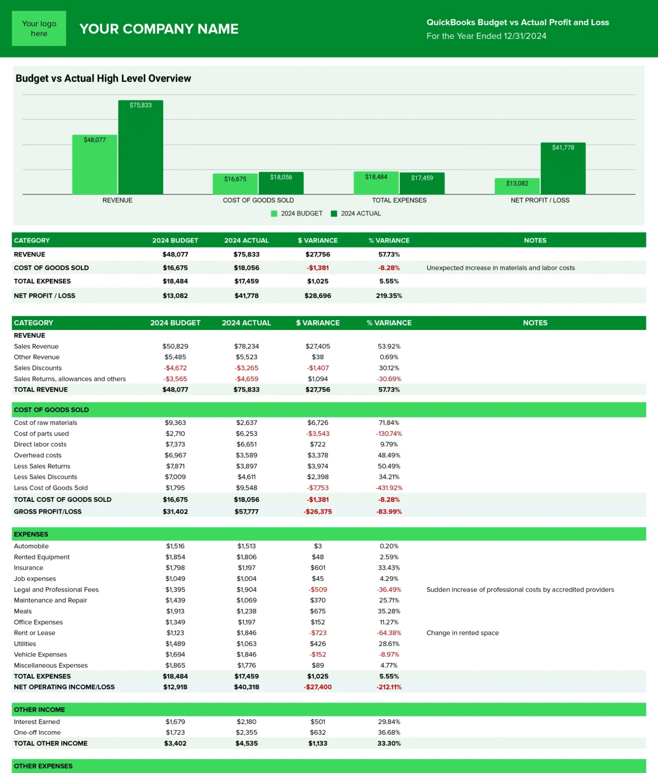 Compare planned spending against actual results with variances calculated automatically. Built-in formulas highlight areas that need attention so you can address issues before they become surprises in board meetings.