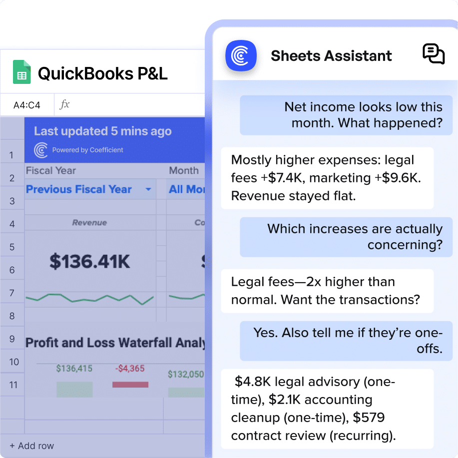 Finance teams save 20+ hours per week by connecting QuickBooks to Coefficient and using our Sheets Assistant to automate financial analysis and reporting.