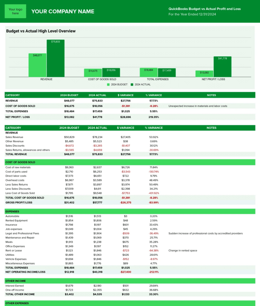 Coefficient’s Budget vs Actual template syncs automatically with QuickBooks data. The system generates reports without manual entry, highlighting differences between expected and actual performance.