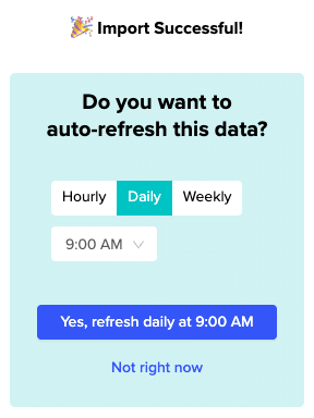 - Schedule auto-refresh (hourly, daily, weekly) to keep data current without manual exports – Set campaign data to refresh hourly, financial data daily