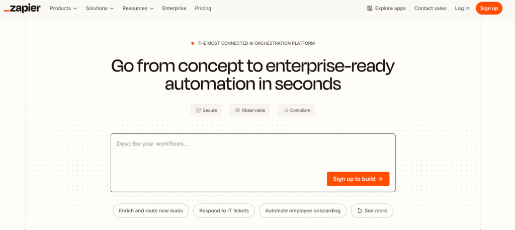 Zapier offers the most accessible entry point. Its visual workflow builder connects: