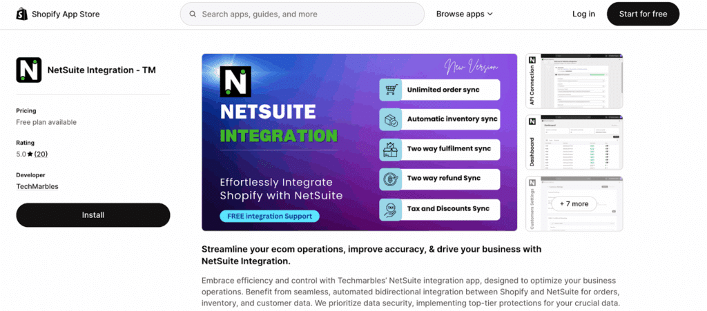 Shopify and NetSuite don’t provide a native, direct integration built by either company. Instead, the Shopify App Store features several third-party apps that connect the platforms. The leading option comes from TechMarbles, with a perfect 5-star rating across 20 reviews and pricing that starts free.