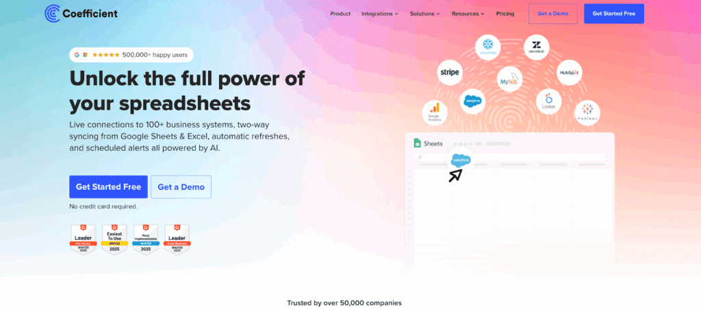 Over 500,000 users across 50,000+ companies use Coefficient, including Spotify, Unity, Uber, Miro, and Klaviyo. With 142 reviews on G2, the platform ranks #2 overall in Big Data Integration and #3 in Data Extraction Tools. Coefficient earned recognition as Momentum Leader and High Performer across mid-market, enterprise, and Asia Pacific regions.