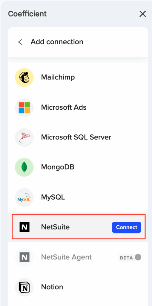 Coefficient provides comprehensive financial data synchronization more effectively than direct API integrations. You can import standard financial reports from NetSuite with configurable periods and export synchronized data to business intelligence platforms like Tableau, Power BI, or Looker from NetSuite.